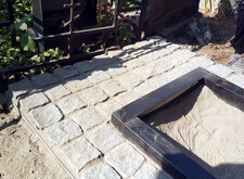 На данном объекте нам предстояло ровно установить покосившийся памятник, а вокруг цветника положить гранитную брусчатку.